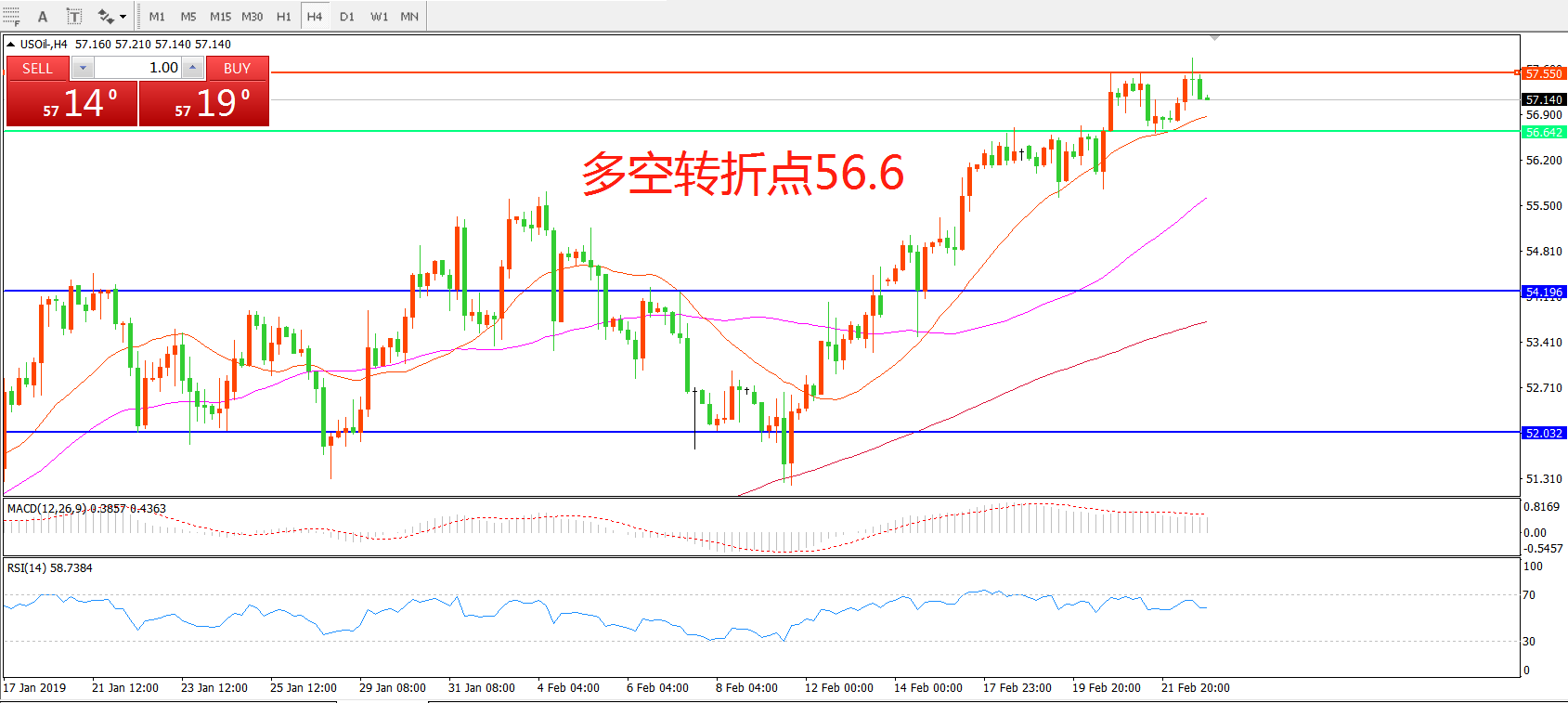 交易策略:在56.60  之上看涨,目标57.50    62.00