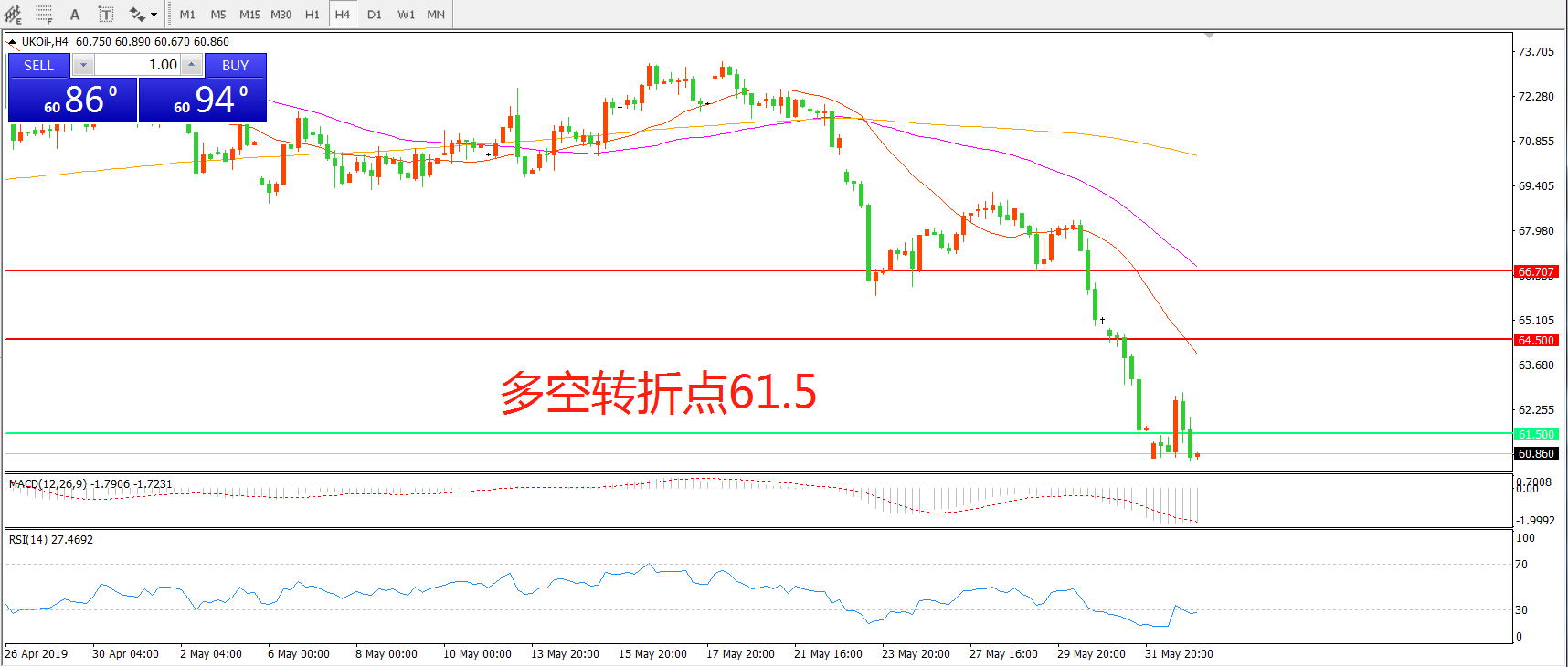 交易策略: 在61.50之下看跌,目标57.50     53.00