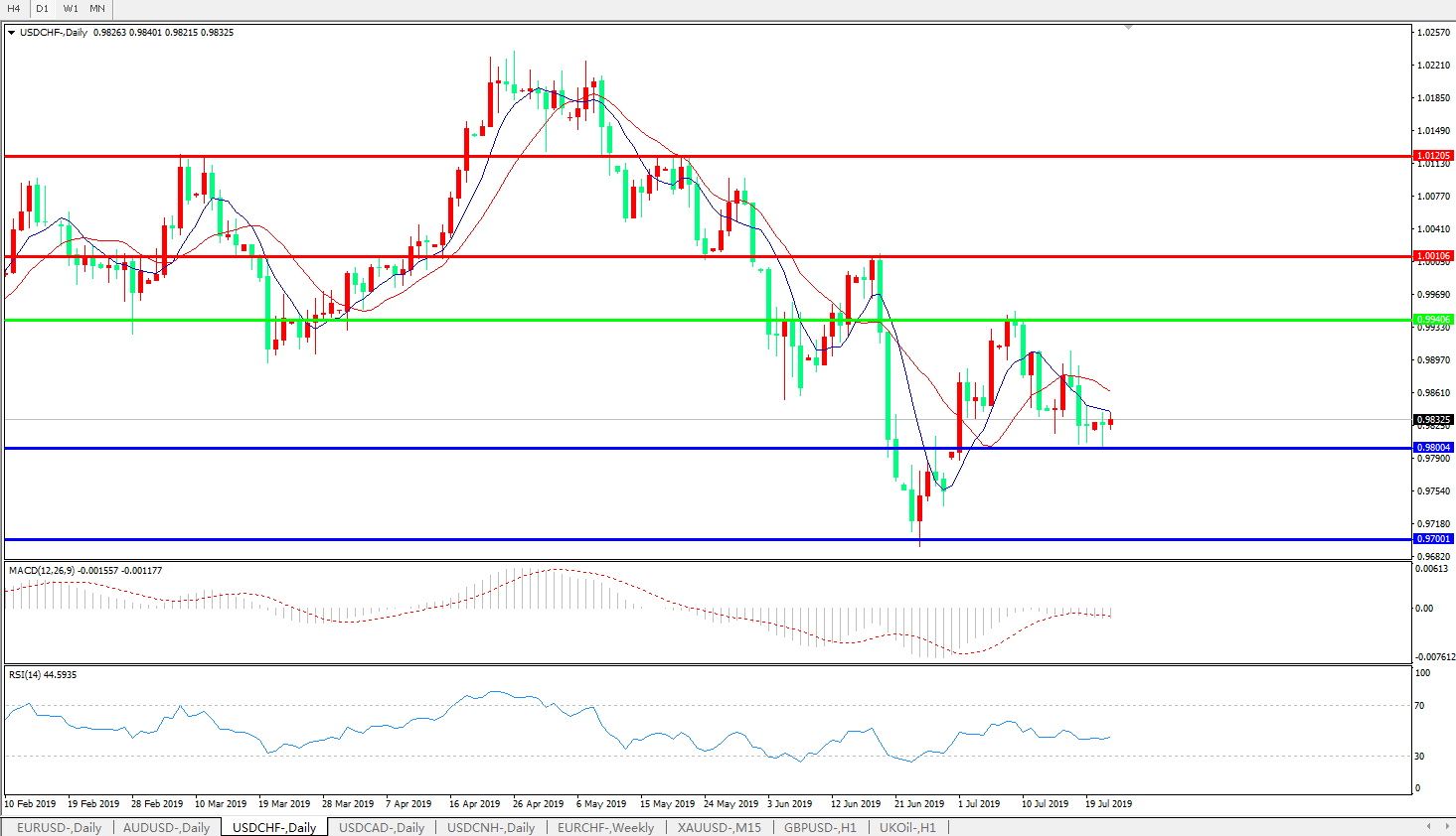 美元兑瑞郎在周一欧洲时段盘中跌至0.9804的低位,为自71日以来的三周新低。原因在于,中东地缘局势在周末再度恶化重新激起了瑞郎的避险买需,同时,美联储重新强化的宽松前景也令美元面临压力;此前,伊朗在周末扣押英国船只事件,令投资者对中东石油运输通道的畅通再度生疑,地缘局势疑云也带动避险情绪升温,令避险货币得利。相比起日语汇率上涨空间还受到其国内选举结果影响的局面,瑞郎的上涨过程中就更加肆无忌惮;但这也意味着压力会更多地来到瑞士央行这一边。本周欧洲央行将发布利率决议,下周美联储也将跟进,全球货币宽松竞赛似乎已经鸣响发令枪,这令已经缺少“弹药”,早已维持着高水平负利率的瑞士央行感到更加难堪。一旦美欧同行行动,难保瑞士方面不会故伎重演,通过强行入市干越的方式来调控汇率水平.