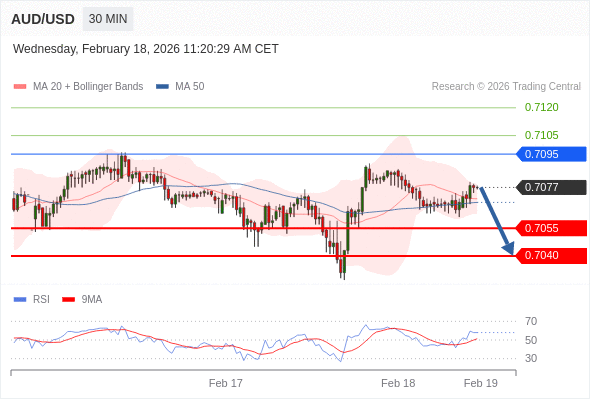 交易策略: 在 0.7095 之下,看跌,目标价位为 0.7055 ,然后为 0.7040 。