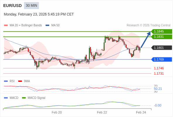 欧元/美元 当日内 : 看涨。