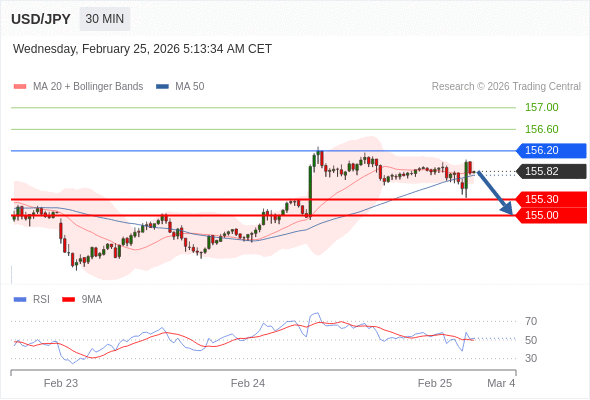 在 156.20 之下,看跌,目标价位为 155.30 ,然后为 155.00 。