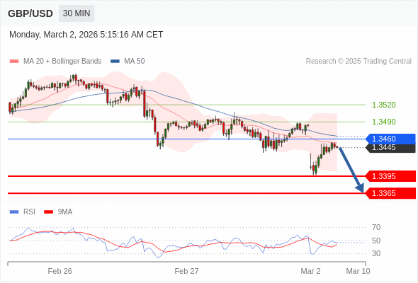 在 1.3460 之下,看跌,目标价位为 1.3395 ,然后为 1.3365 。