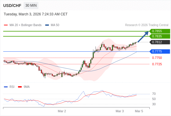 在 0.7775 之上,看涨,目标价位为 0.7835 ,然后为 0.7855 。