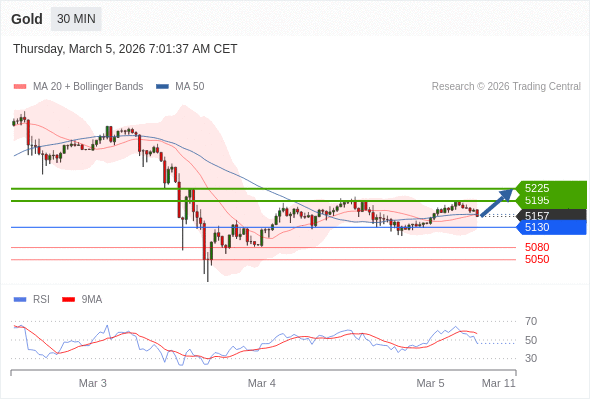 交易策略: 在 5130 之上,看涨,目标价位为 5195 ,然后为 5225 。