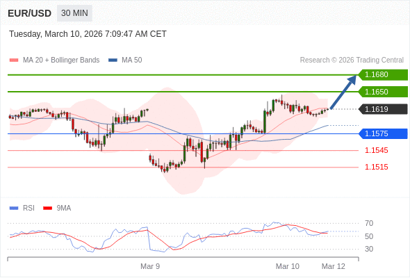 在 1.1575 之上,看涨,目标价位为 1.1650 ,然后为 1.1680 。