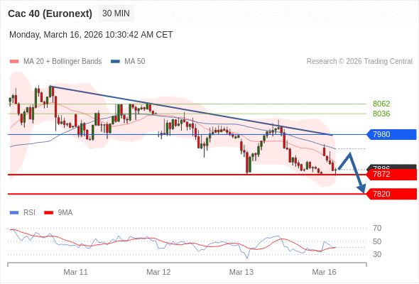 法国CAC指数期货 (Euronext) (H6) 当日内: 被下降趋势线拖累。