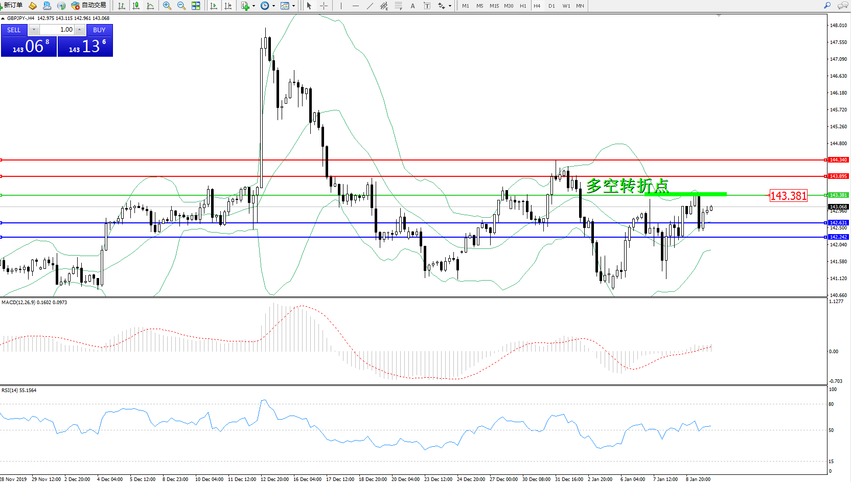 交易策略:143.381下方看跌,目标142.631、142.242