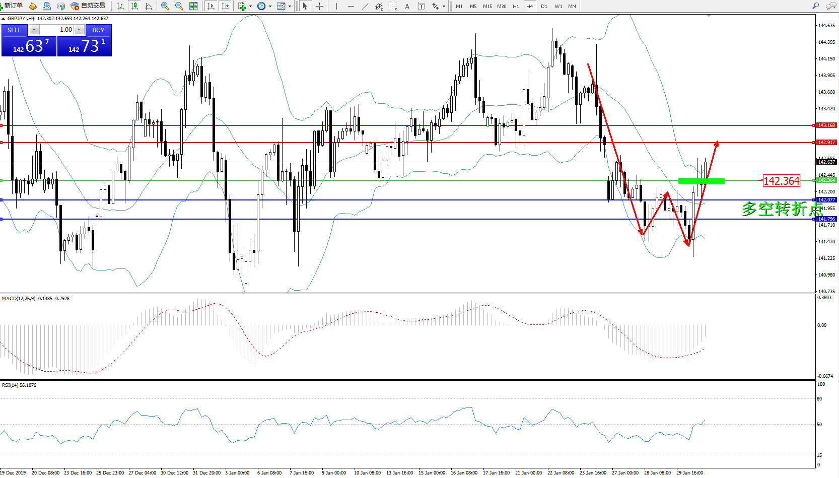 备选策略:142.364下方看跌,目标142.077141.796