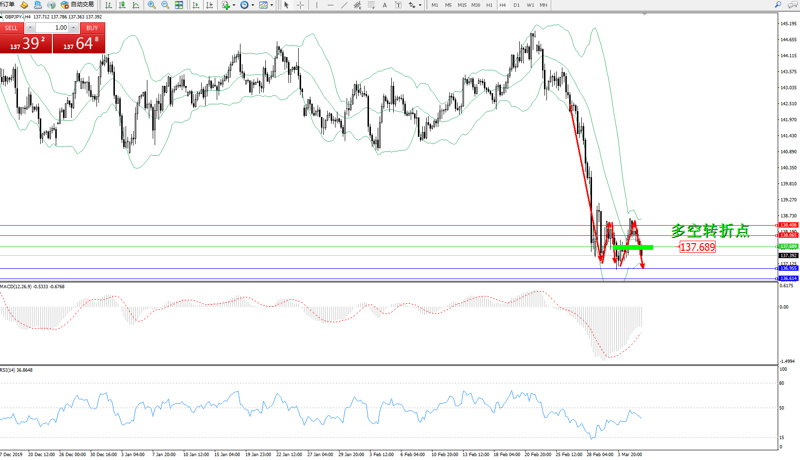 交易策略:137.689下方看跌,目标136.955、136.614