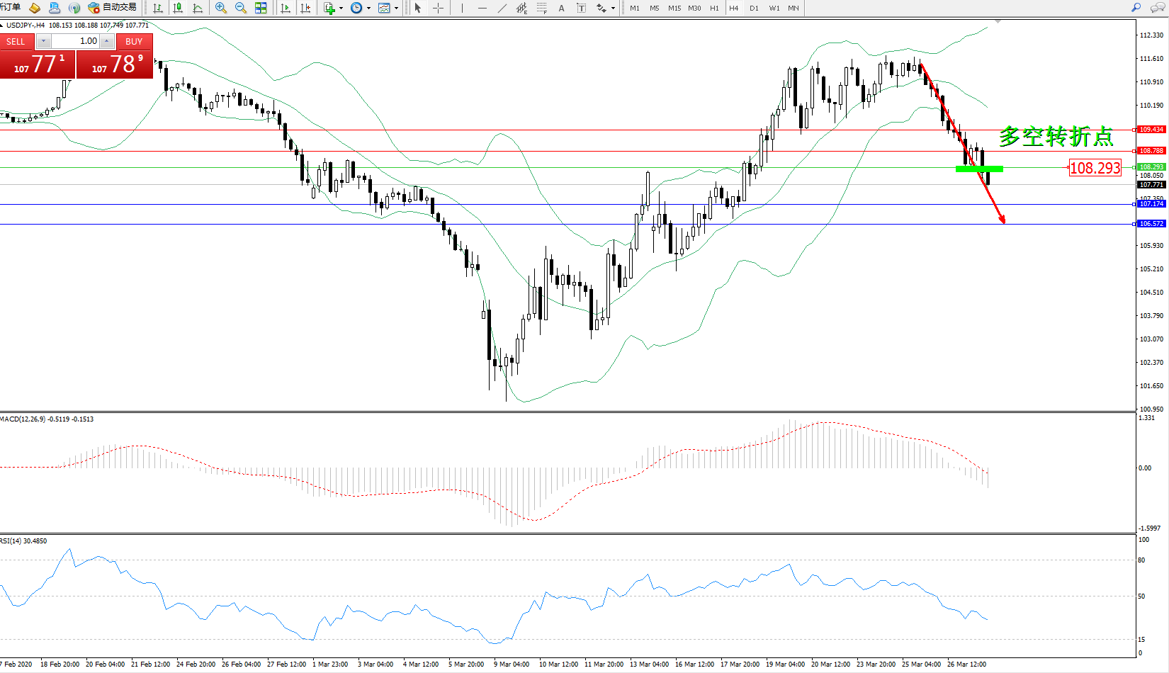 交易策略:108.293下方看跌,目标107.174106.572
