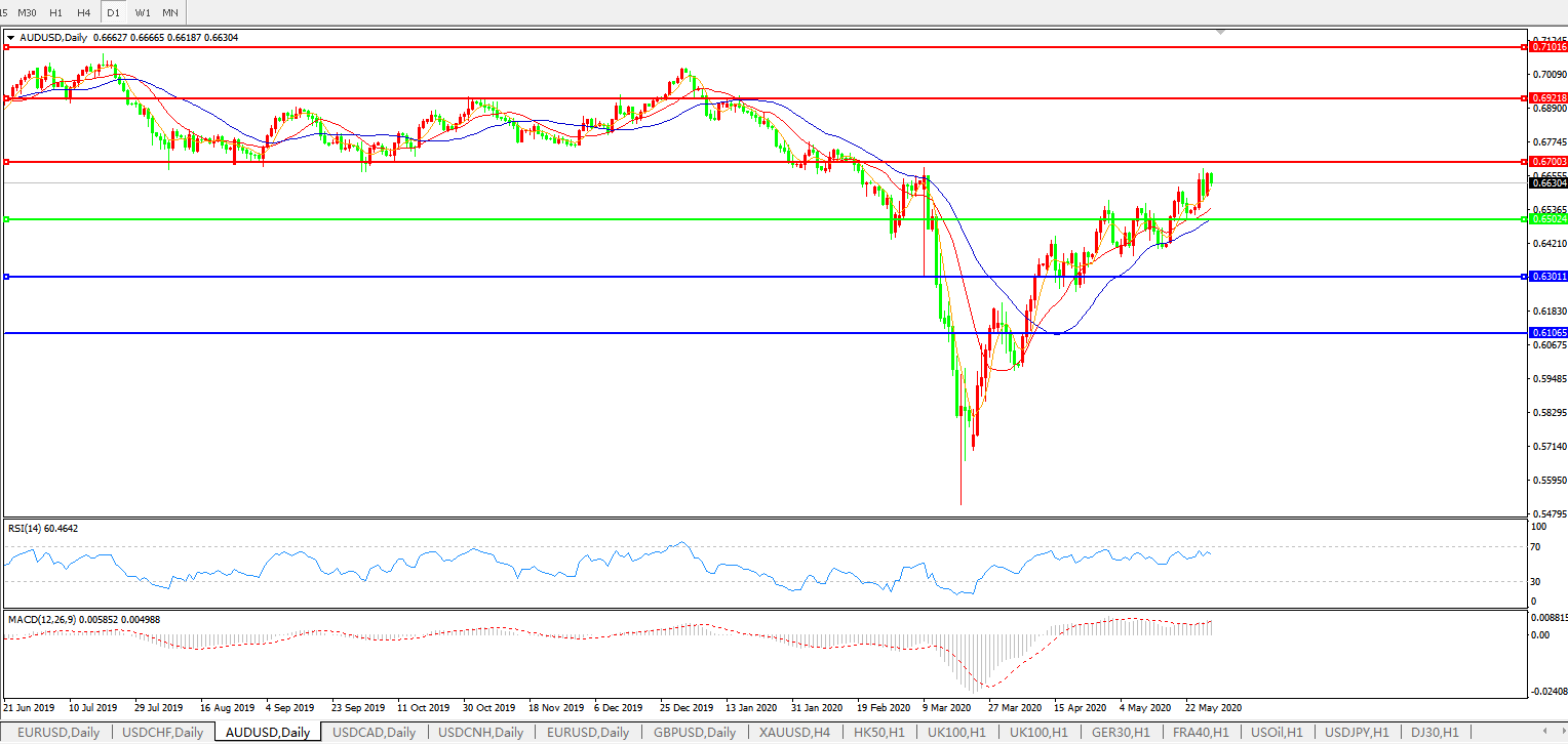 技术面简析:日图均线呈有序多头排列,汇价高位维持偏强整理态势但0.67关口压力持续存在,MACD运行于0轴上方且量能持续小幅放量,RSI震荡走弱,预计汇价大概率将在整理后进一步上行。