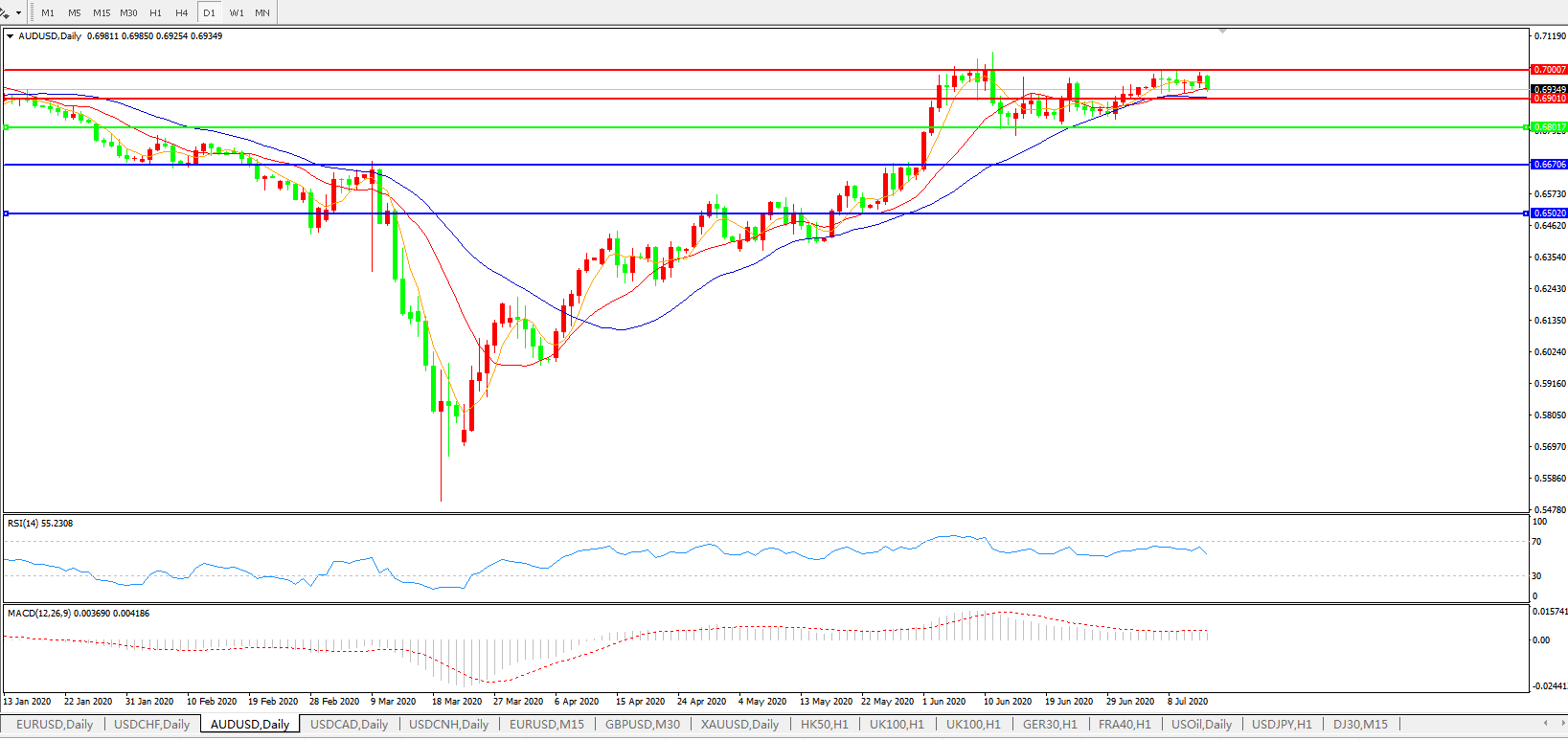 技术面简析:日图均线维持发散上行态势,汇价小幅回落整理,MACD运行于0轴上方但量能小幅缩量,RSI缓步走弱,预计汇价短线大概率将继续整理,关注0.7000 关口压制。