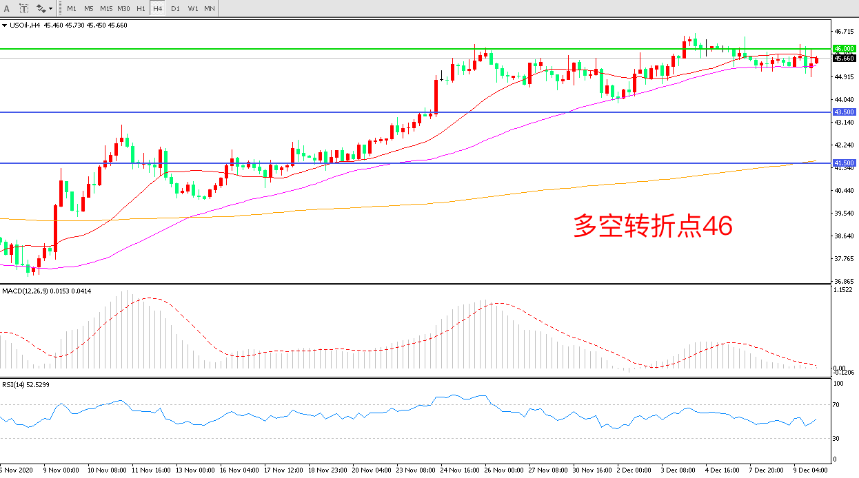 4小时图看,油价陷入高位震荡,46美元成为上方阻力55周期均线成为短期支撑MACD红柱减少,RSI指标向上,日内延续震荡概率较大。