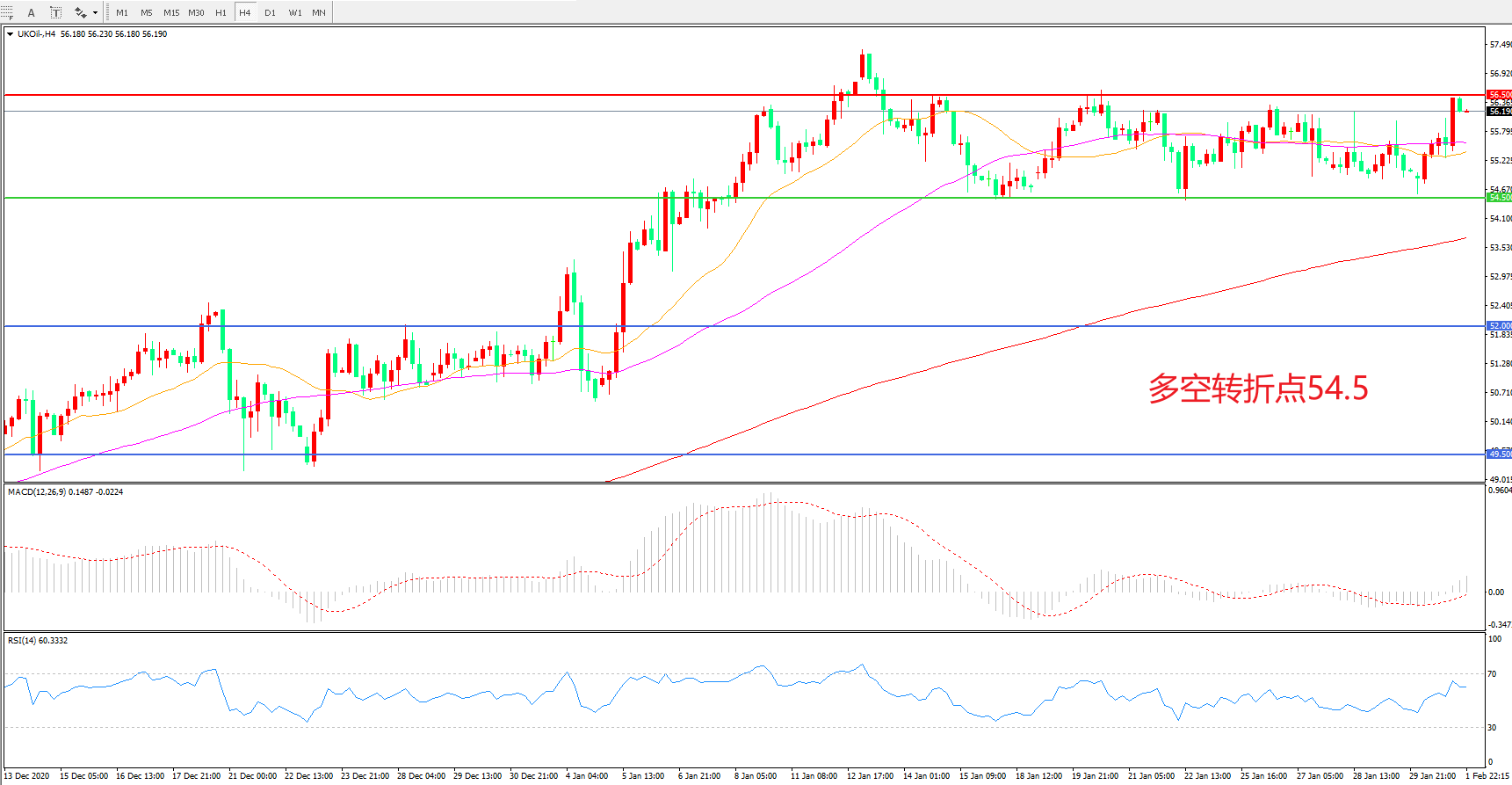 交易策略:  在54.50之上看涨,目标56.50    60.00