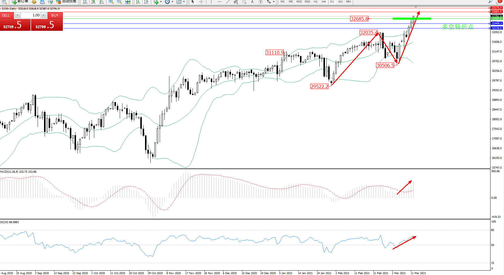 道琼斯指数3月12日(周五)收盘上涨292.46点,涨幅0.90%,报32778.05点;美股收盘,三大股指涨跌互现,道指连续三天创收盘历史新高,美债收益率的飙升令科技股承压。价值股吸引轮动买盘,金融和工业板块上涨;美国加速接种疫苗以及1.9万亿美元刺激法案的通过导致美债收益率突破1.64%。经济摆脱长达一年的新冠疫情封锁的前景重新点燃通胀担忧,推动美国国债收益率再次大涨。加元创2018年2月以来的最高水平,因为该国上月新增就业远超预期且大宗商品价格保持坚挺。美国最终需求生产者价格指数(PPI)录得近两年半来最大同比增幅,不过就业市场相当疲软,可能令企业更难将成本上升转嫁给消费者。