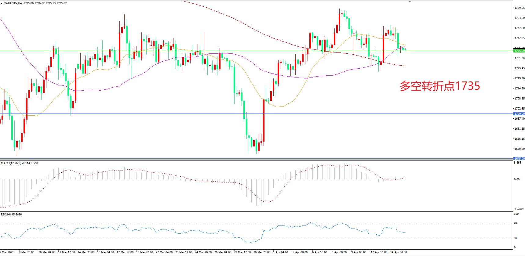 周三(4月14日),美联储主席鲍威尔四天内第二次提到美国经济进入加快增长的拐点,且未提及缩减QE的路线图,市场风险情绪受到提振,10年期美国国债的收益率上升,现货黄金承压下挫,收报1735.93美元/盎司。目前来看,金价回落更多是技术性的回调,1750美元既是短期技术阻力位,也是心理阻力位。