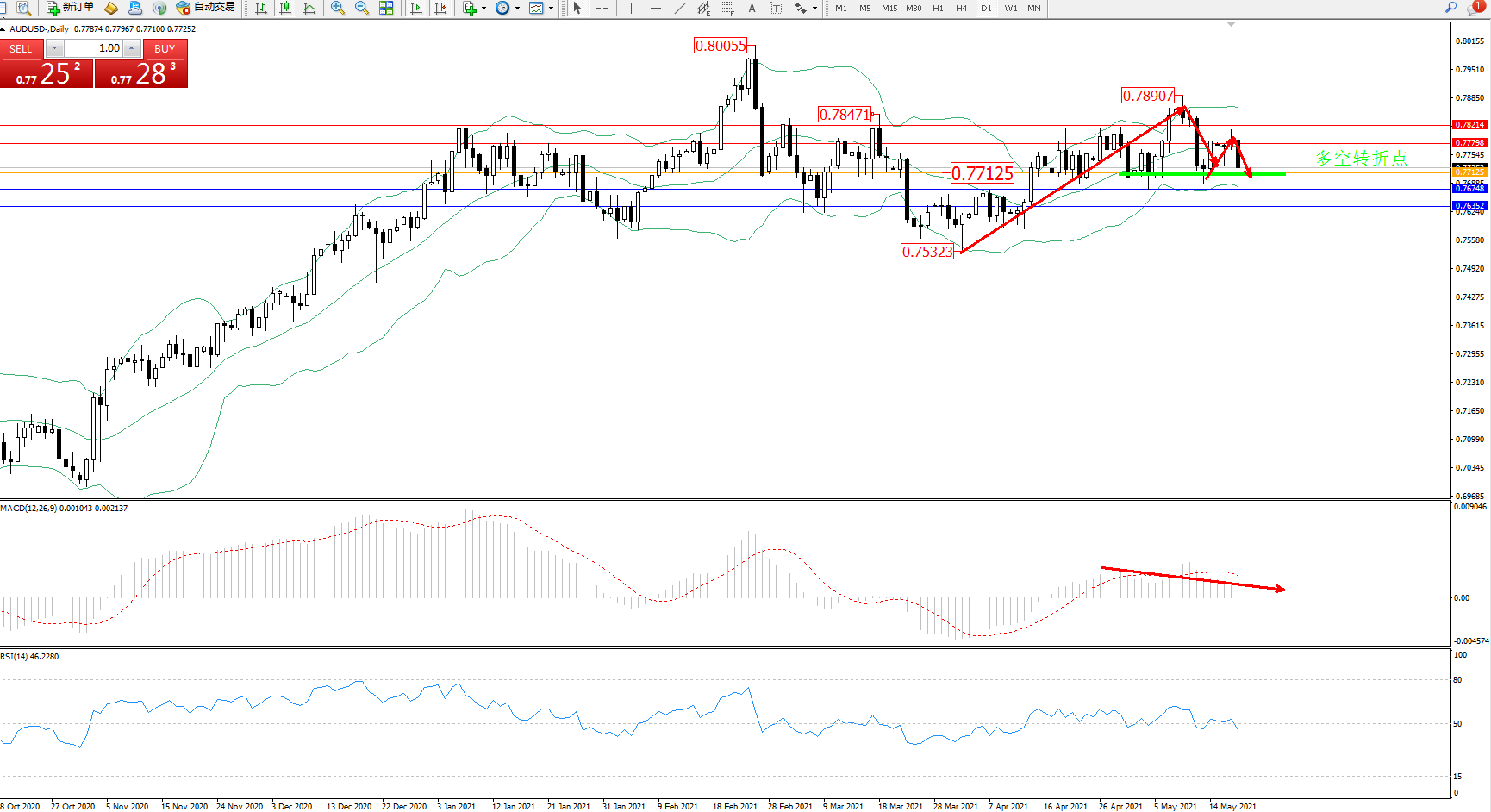 备选策略:0.77125下方看跌,目标0.76748、0.76352