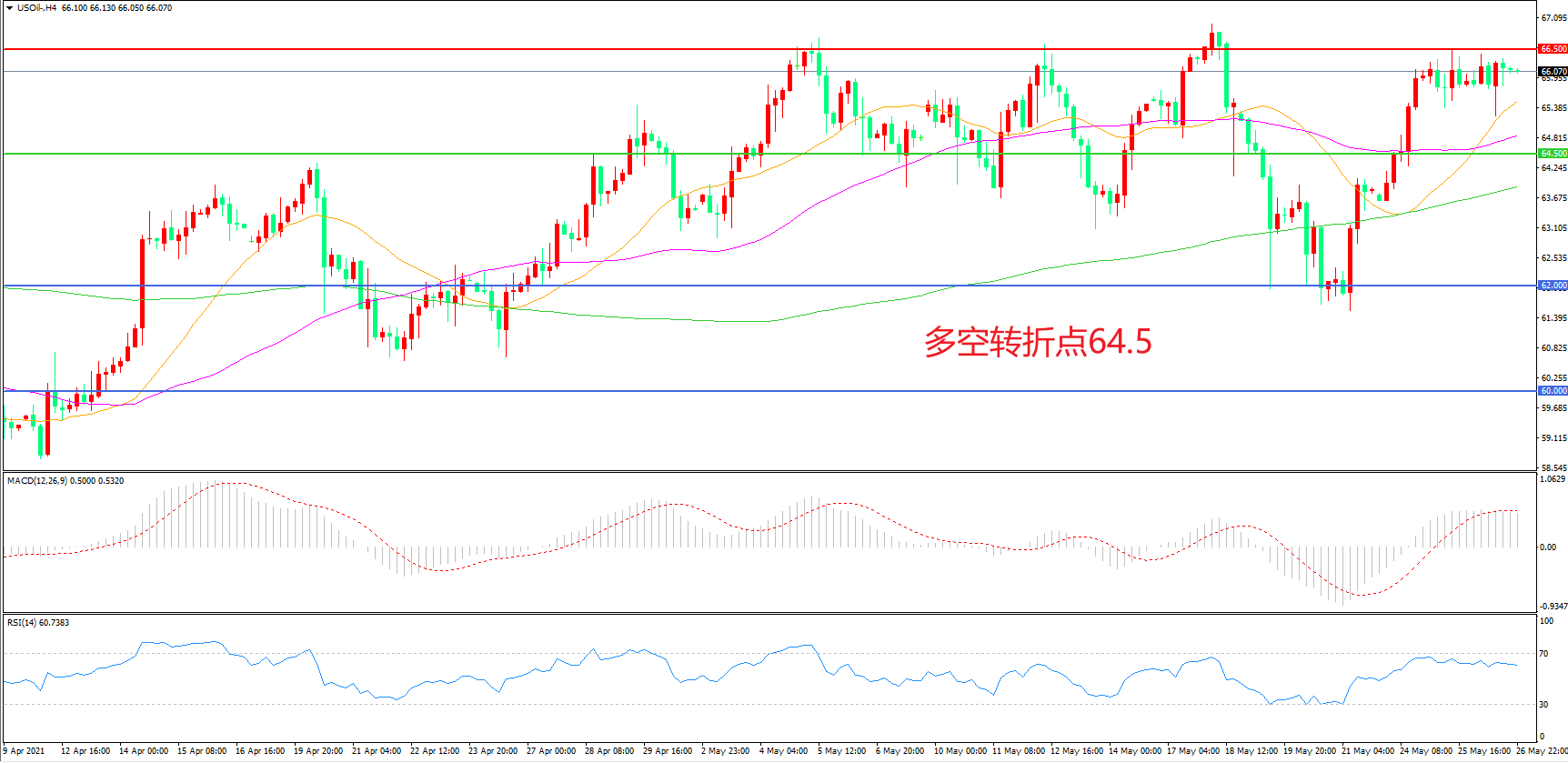 4小时图看,油价延续高位调整,区间震荡迹象较为明显,21周期均线成为下方支撑,66.5美元成为中期阻力,MACD红柱增加,RSI指标向上,日内震荡上行概率较大。