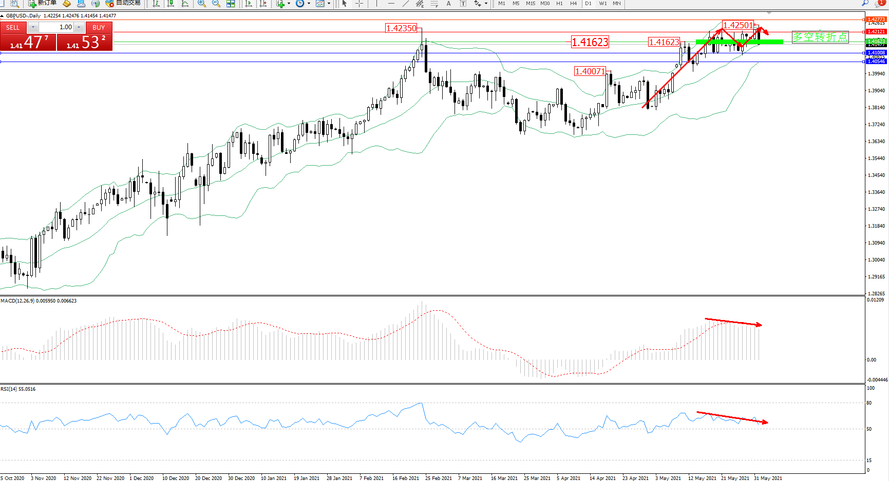 备选策略:1.41623上方看涨,目标1.42121、1.42773