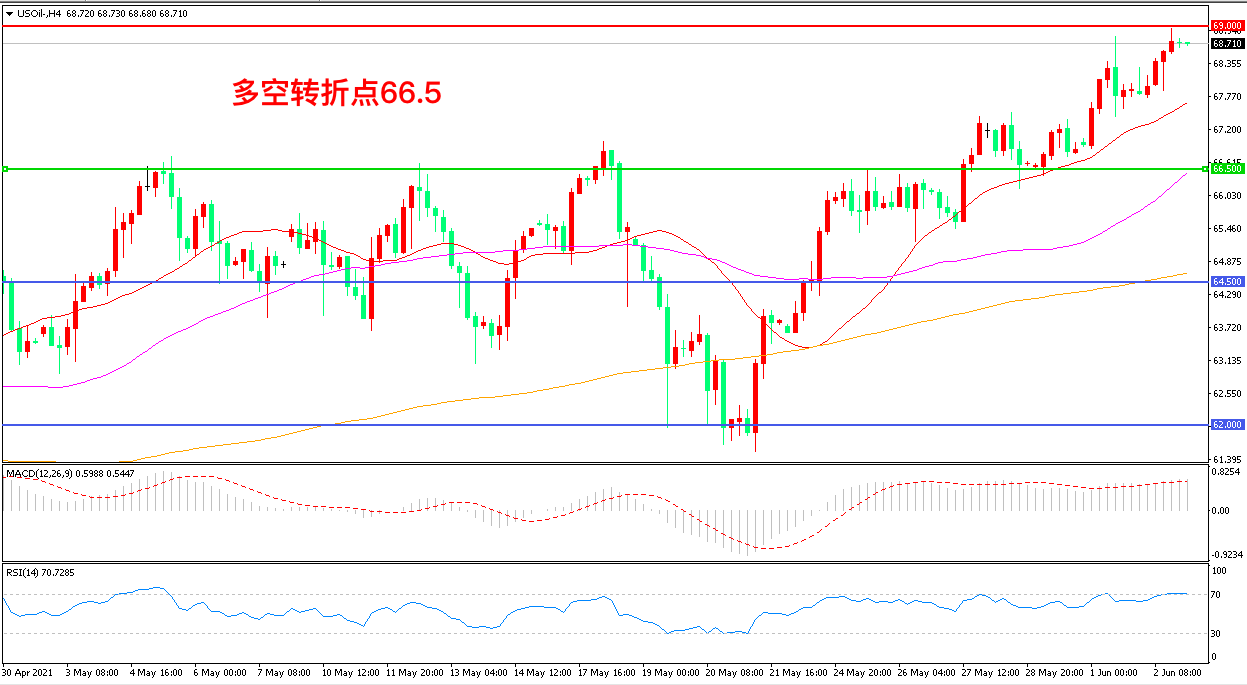 周四(6月3日),根据美国石油协会公布的数据显示,当周API美国原油库存骤降536万桶,远超市场预期,多头信心受到鼓舞,美国WTI原油高歌猛进,收报68.71美元/桶,创下两年以来新高。今晚23:00,市场将迎来最重磅的EIA库存数据,如果EIA与API表现一致,有可能推动油价进一步走高。