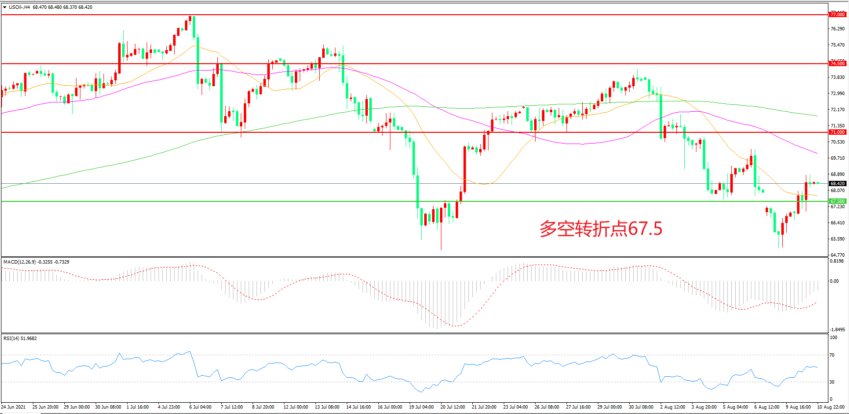 4小时图看,油价跳空低开后震荡反弹,67.50美元成为短期多空分水岭,均线系统逐渐走平,MACD绿柱缩短,油价震荡上行概率较大。