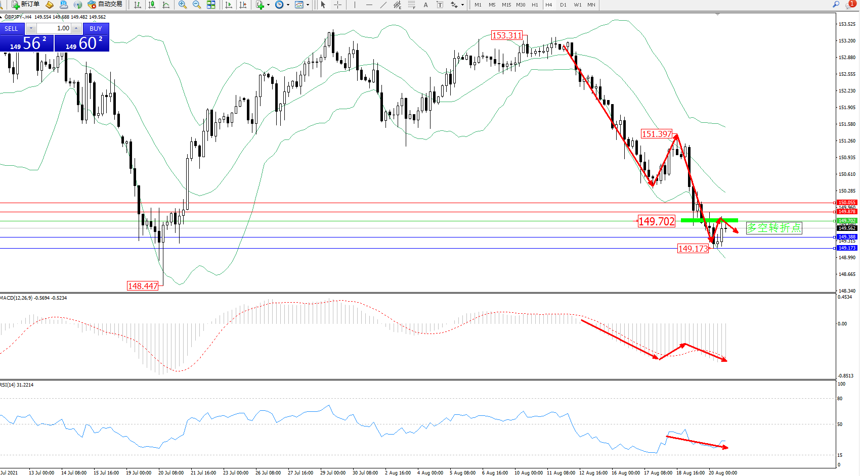 交易策略:149.702下方看跌,目标149.388、149.173