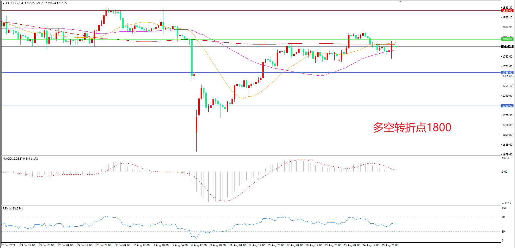 4小时图看,金价在重磅会议来临前整体波幅较窄,55周期均线成为下方支撑,1800美元成为短期阻力,MACD红柱缩短,RSI指标走平,日内震荡上行较大。