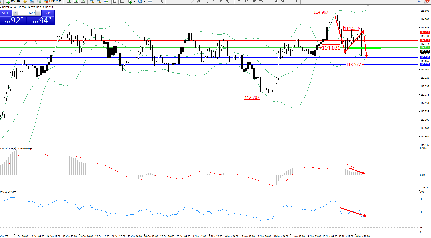 交易策略:114.021下方看跌,目标113.758、113.577