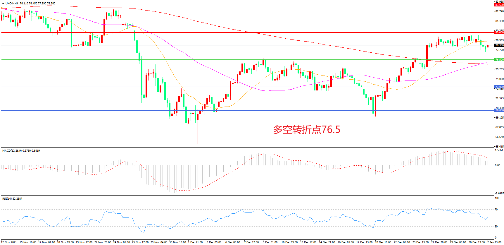 4小时图看,油价延续区间震荡,横盘迹象明显,76.5美元成为下方支撑,80美元成为上方阻力,MACD红柱增加,RSI指标走平,日内震荡上行概率较大。