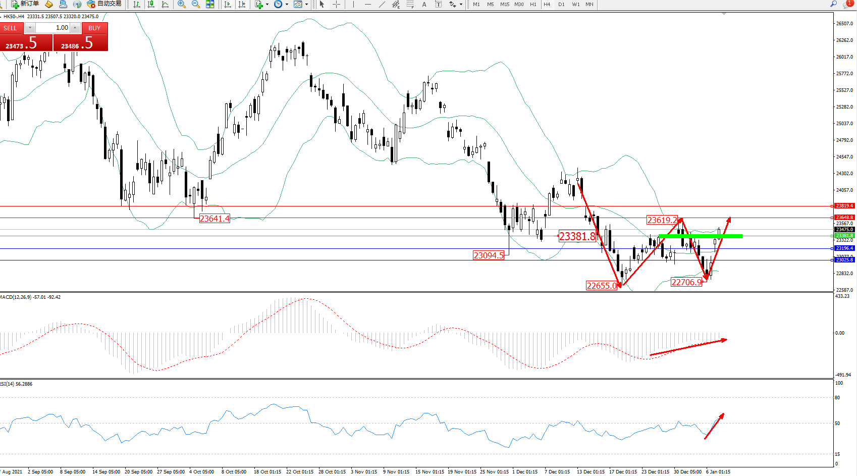 恒指HK50 ——4小时K线图显示: