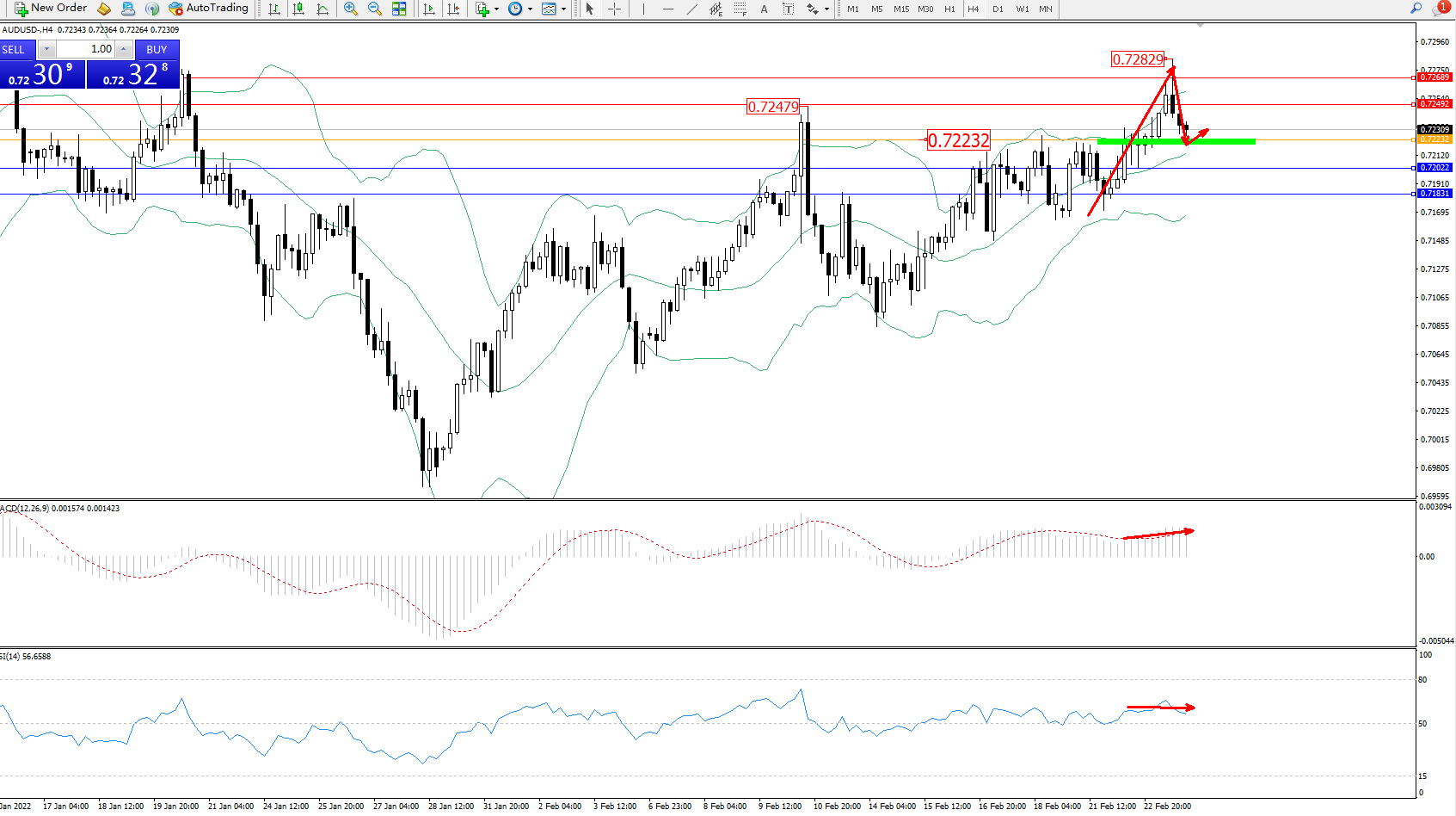 备选策略:0.72232下方看跌,目标0.72022、0.71831