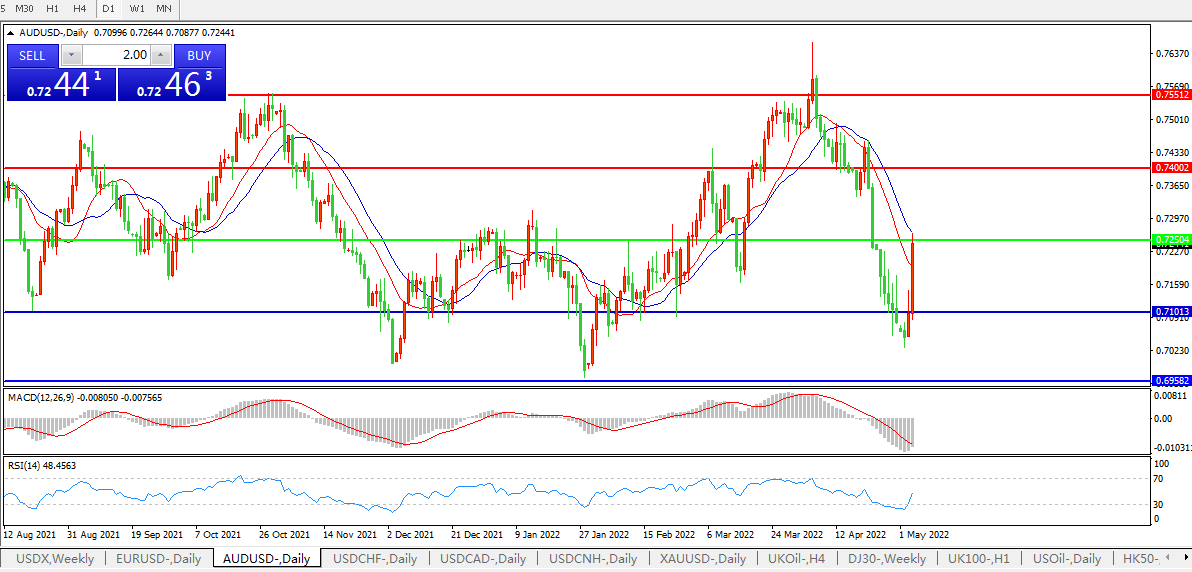 交易策略:0.7250上方看涨,目标0.7400、0.7550