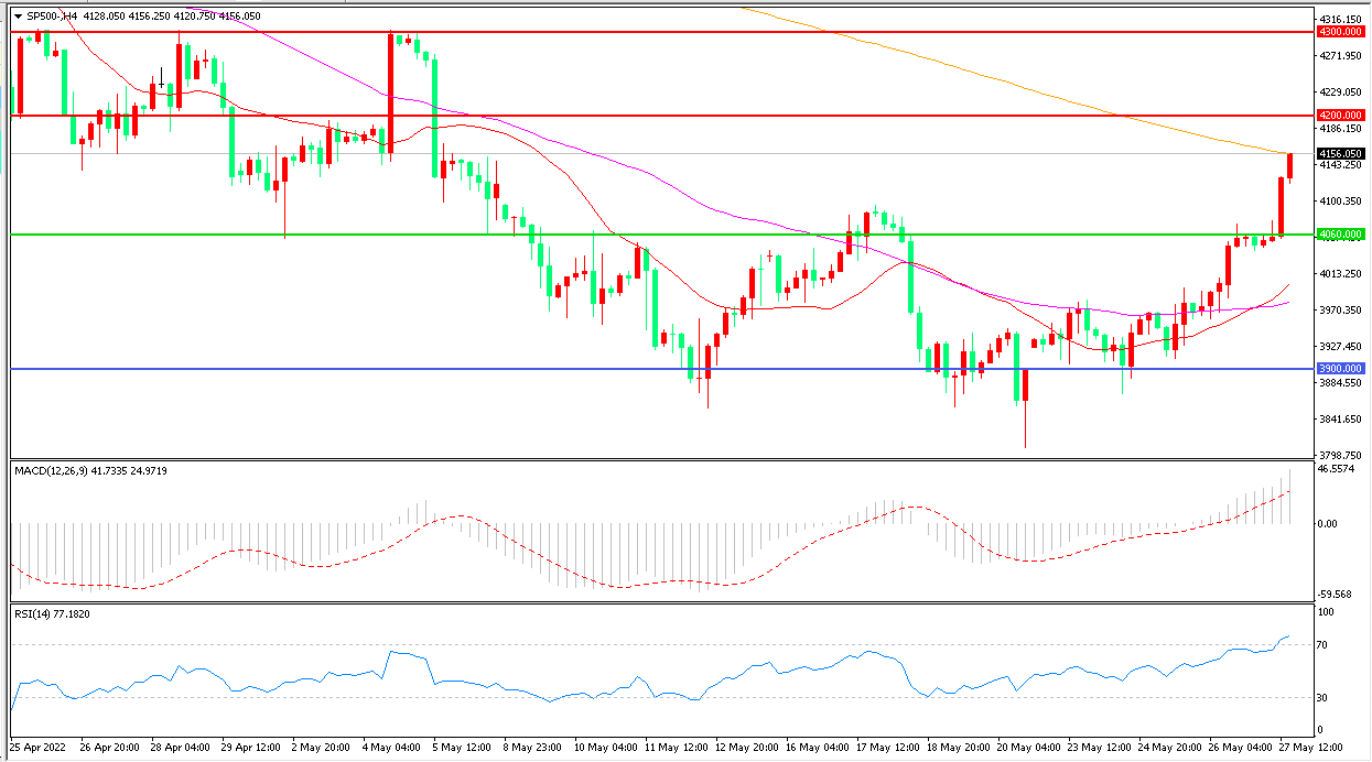 4小时图看,标普500长阳连续拉升,短线走势偏强,4060成为短线支撑,MACD红柱增加,RSI指标兴上,日内延续上行概率较大。