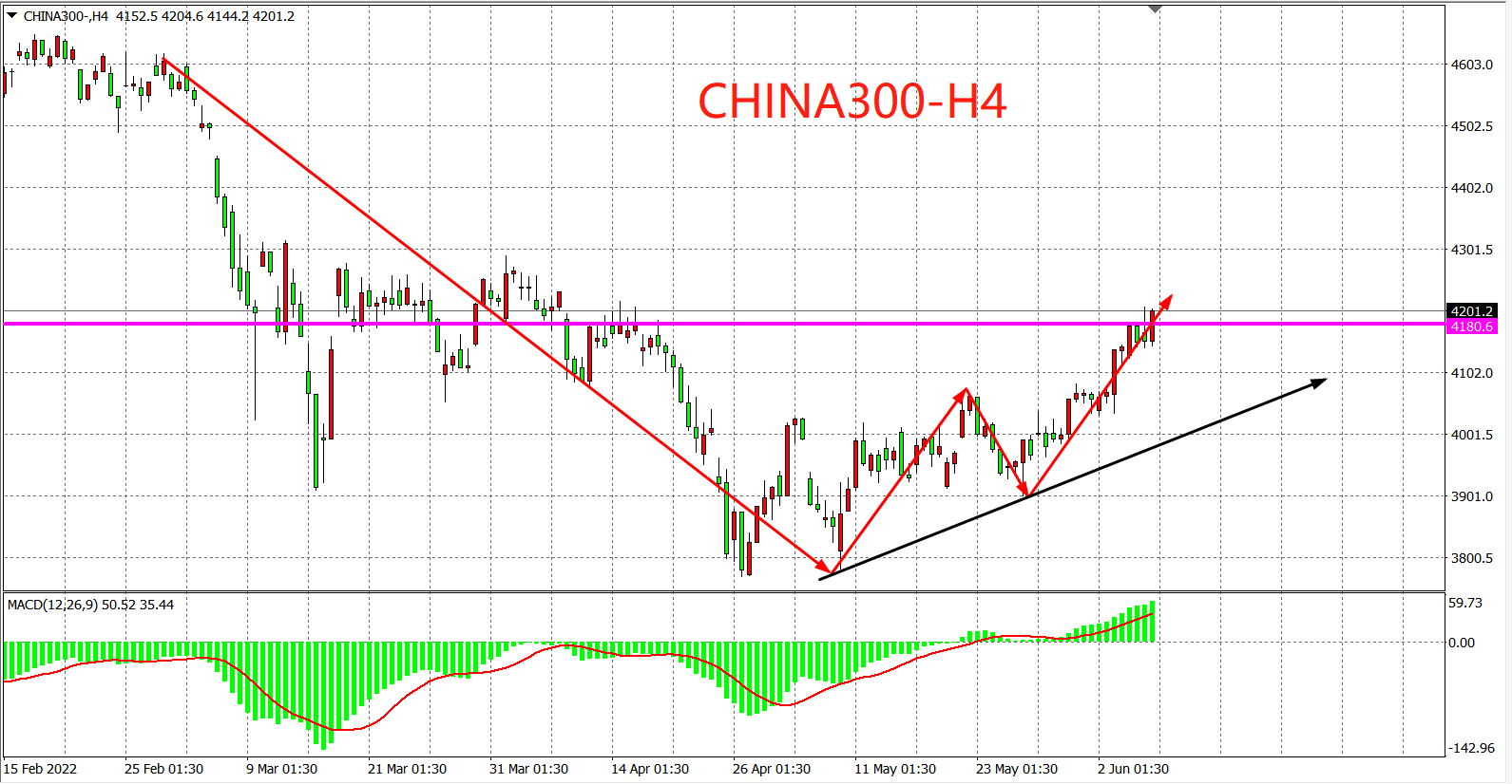 4小时图看,沪深300一改上个交易日的颓势,盘中受4180的压制迟迟不见突破,午盘迅速拉升上破,最终收盘于4200之上,顺利攻破阻力。K线形态形成“看涨吞没”的中继信号,预示上涨行情有望延续,日内大概率再进一步反弹走高