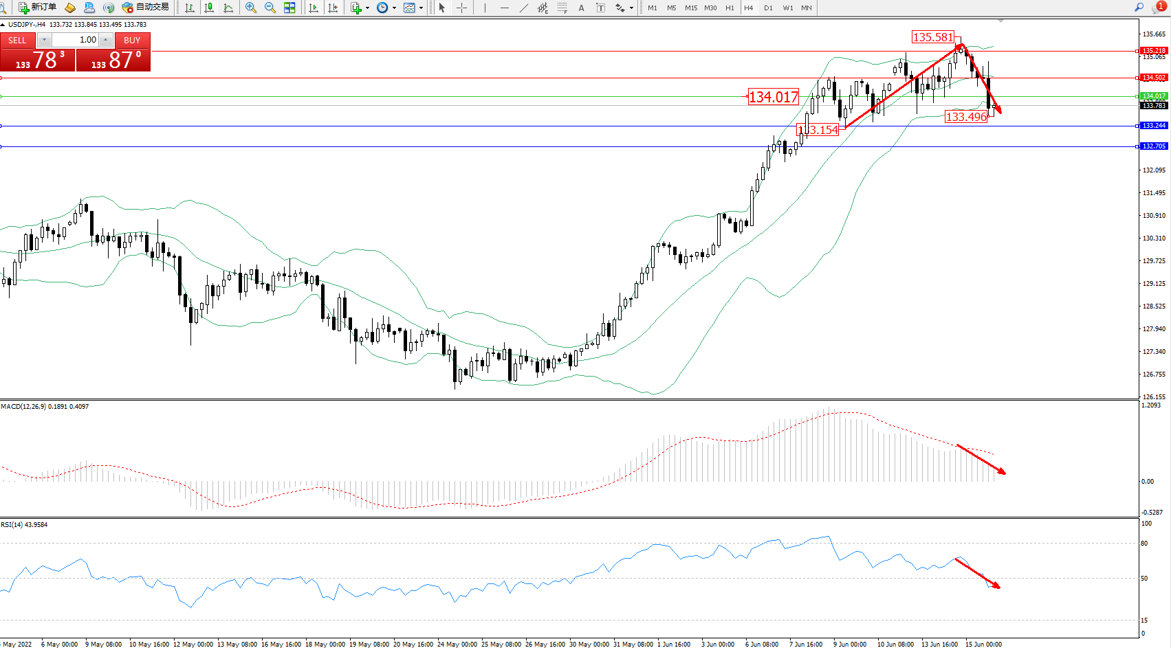 备选策略:134.017上方看涨,目标134.502、135.218