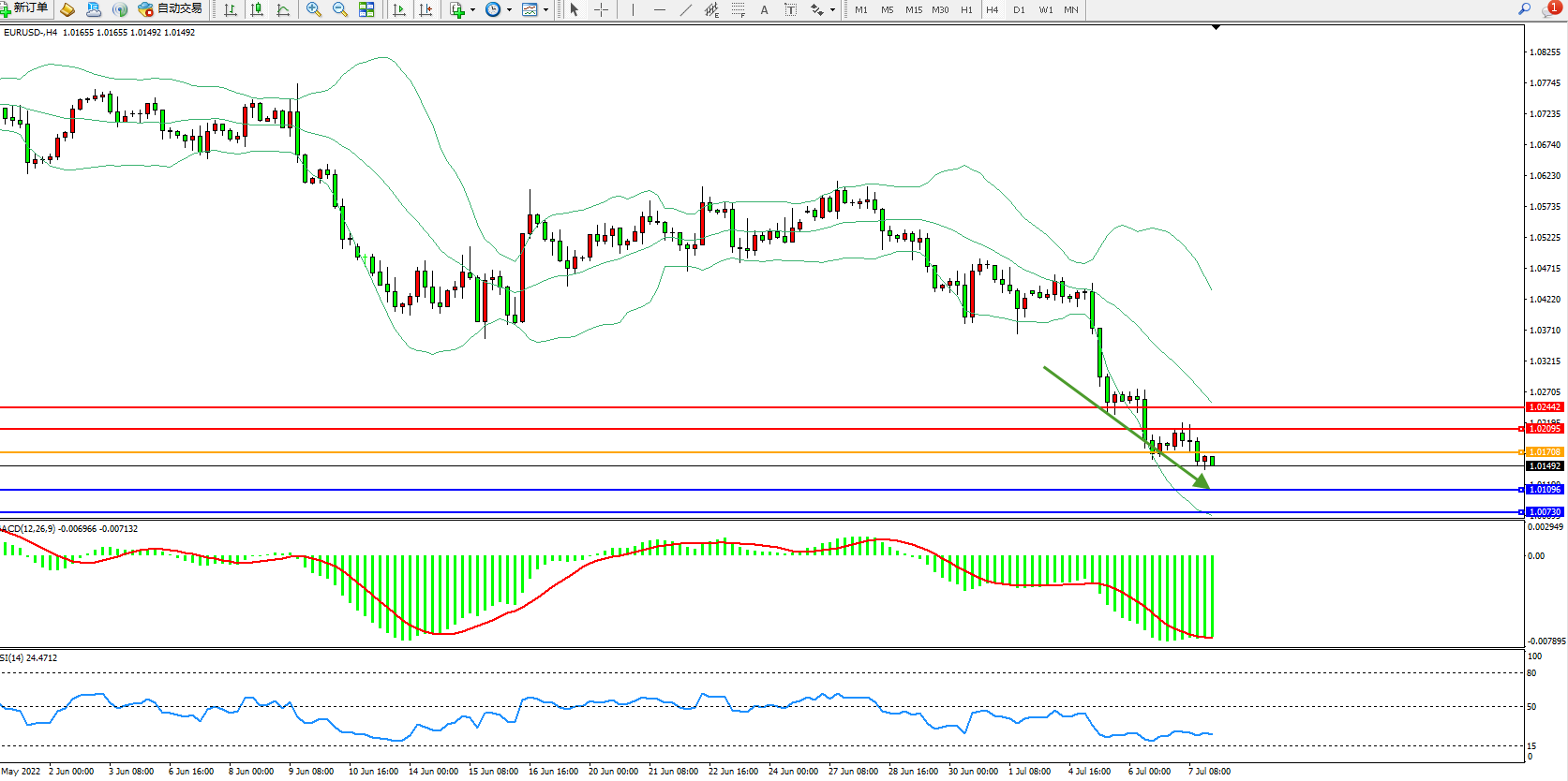 4小时图看:空头动力延续布林带指标通道中下轨区间持续震荡下行,短期跌势未见有止步迹象,布林带指标呈收口走势中,MACD指标处于空头区域低位维持整理平移,RSI指标处于空头区域低位维持弱势徘徊;