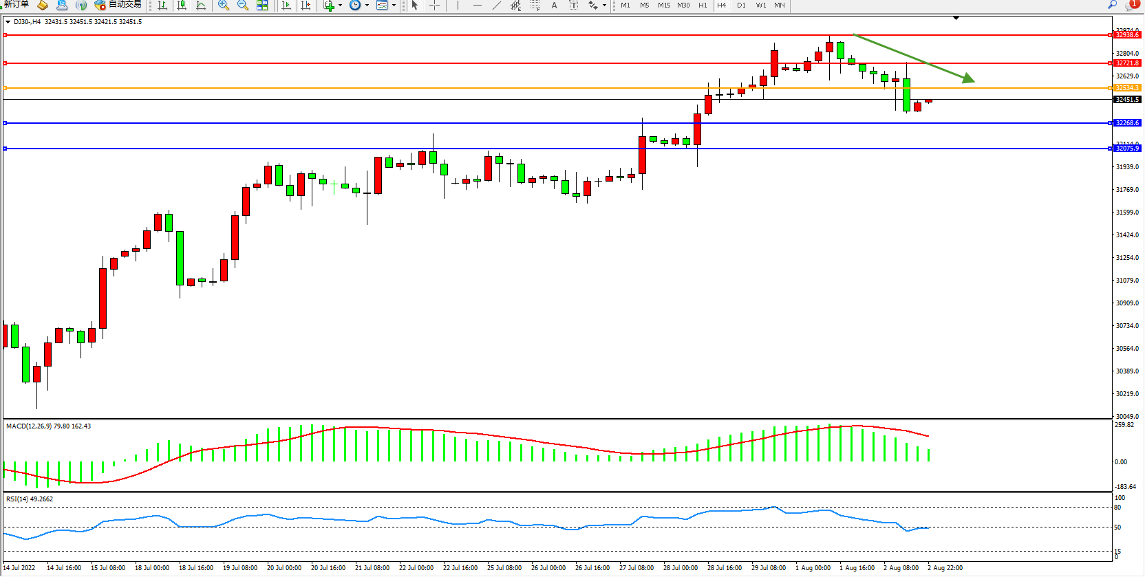 道琼斯指数DJ30——4小时K线图显示: