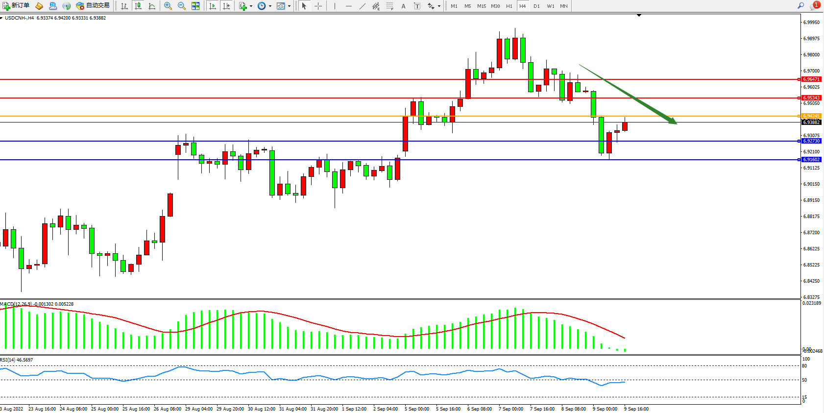 交易策略:6.94245下方看跌,目标6.92730、6.91602