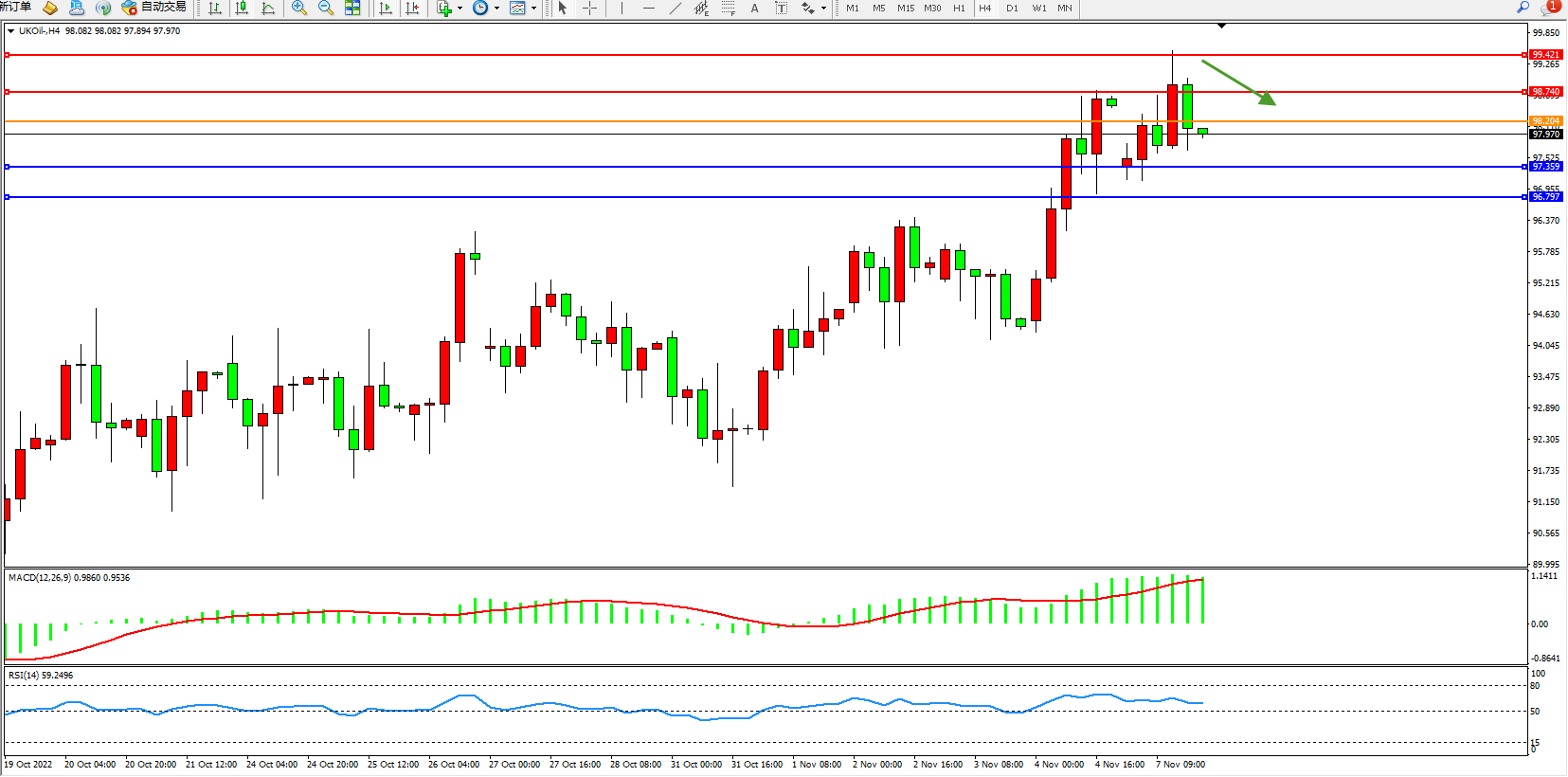 布油维持97.969附近震荡,市场仍在应对油价高企和发达市场经济前景不佳带来的需求疲软迹象。预计2022年第四季度全球需求将比去年同期仅增长60万桶/日,并在明年放缓。