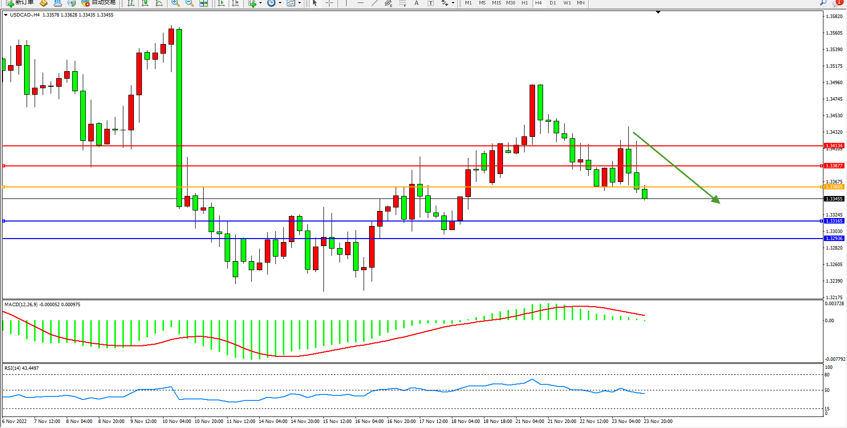美元加元USDCAD——4小时K线图显示: