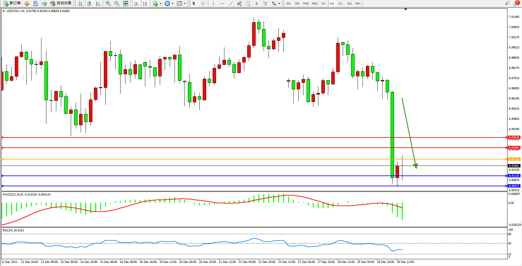 交易策略:6.91135下方看跌,目标6.91135、6.90472