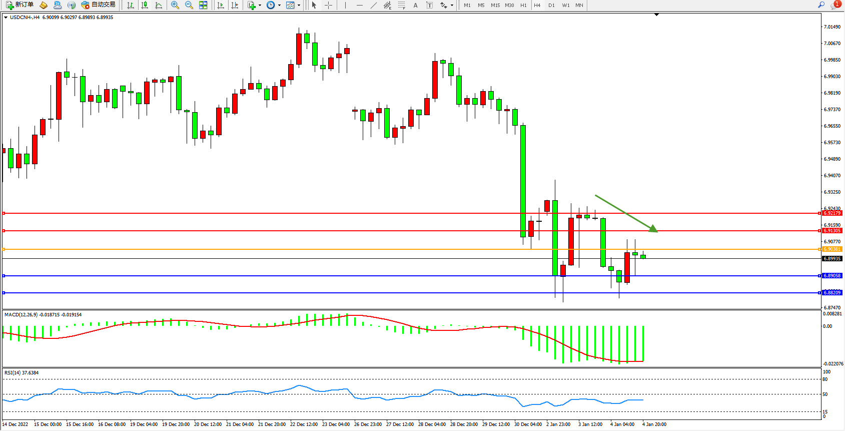 美元人民币USDCNH——4小时K线图显示: