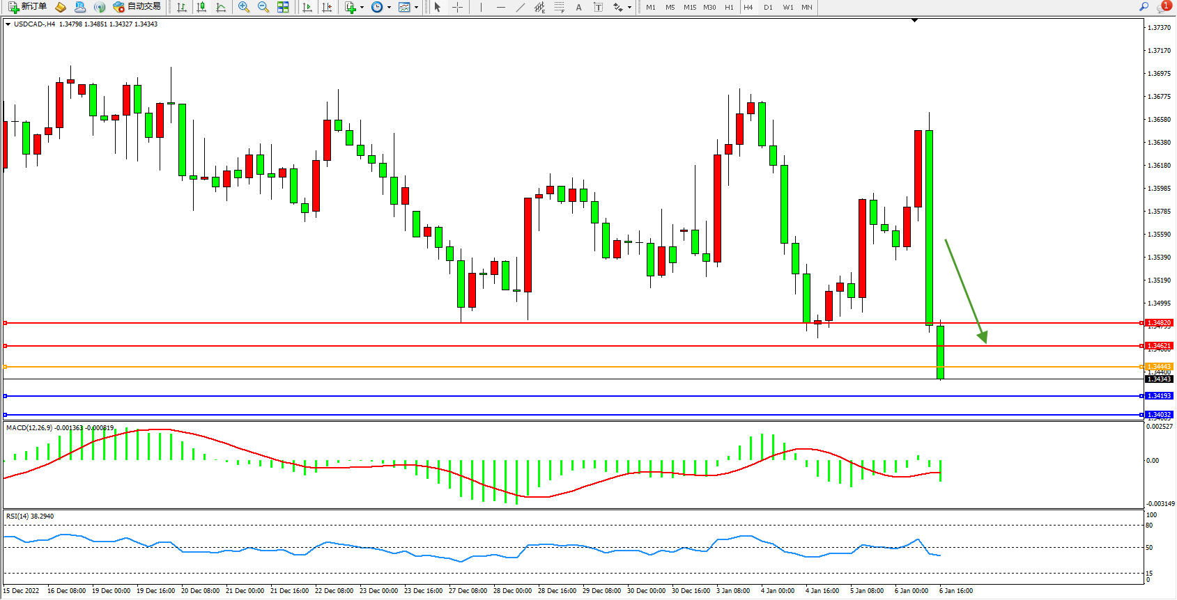美元加元USDCAD——4小时K线图显示: