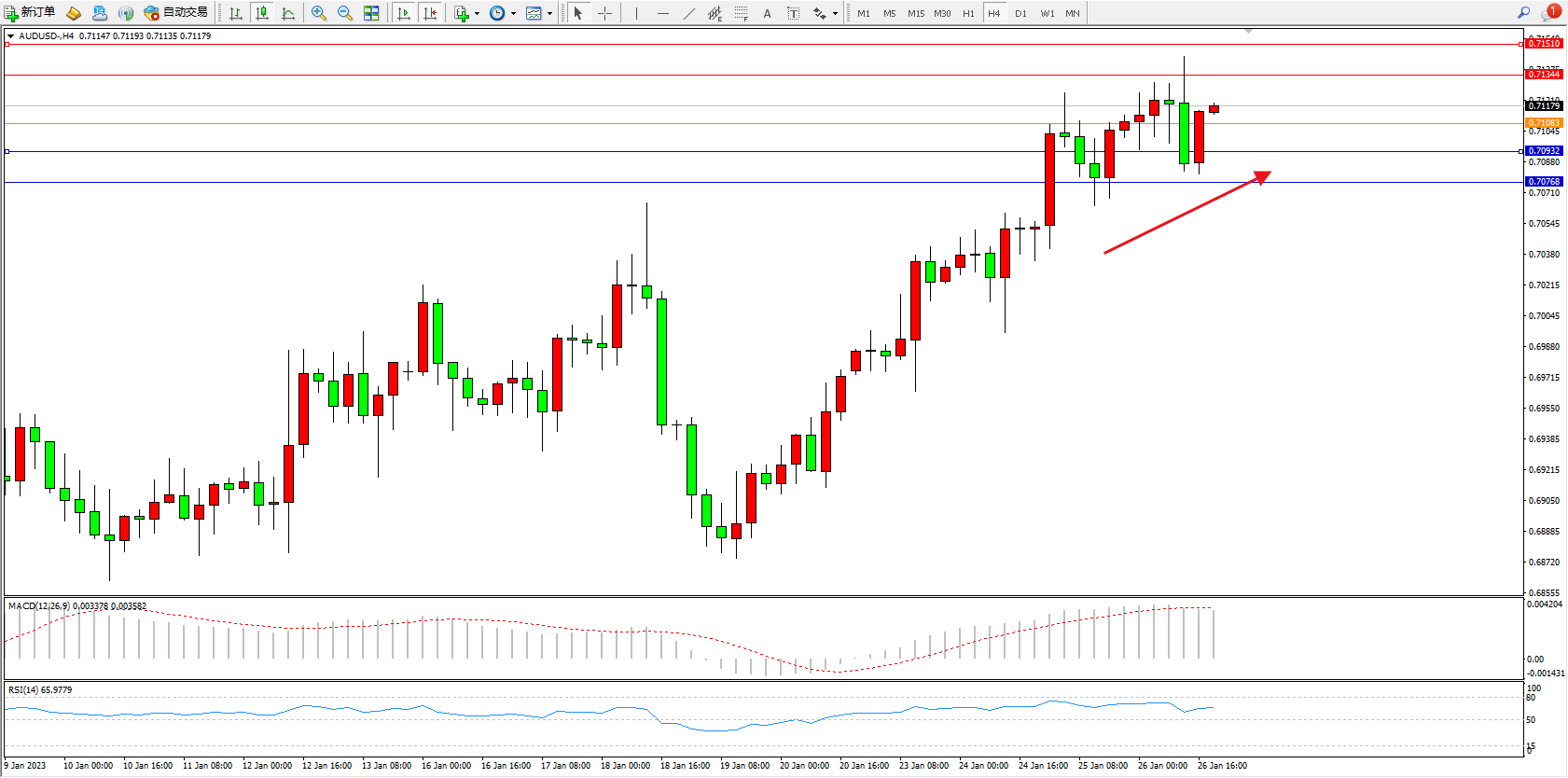 澳元美元AUDUSD——4小时K线图显示:
