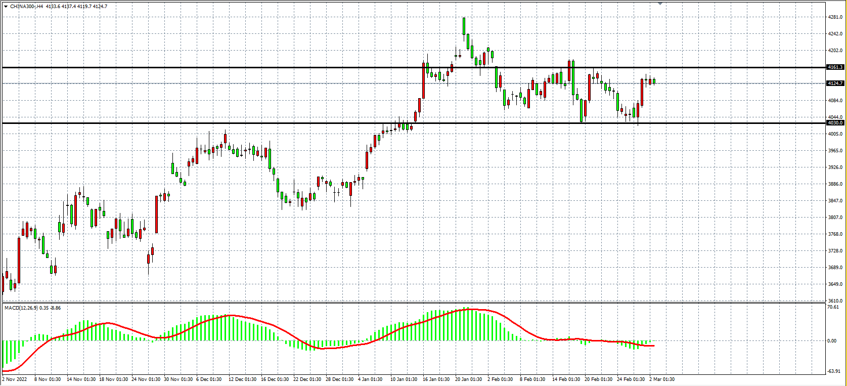 4小时图看,沪深300在4030附近支撑企稳后继续开启反弹,同时MACD于零轴之下缩量,行情有望展开上攻,当前走势于4030-4160形成箱体,若上破4160后市有望打开上行空间,上方看4250-4300附近。