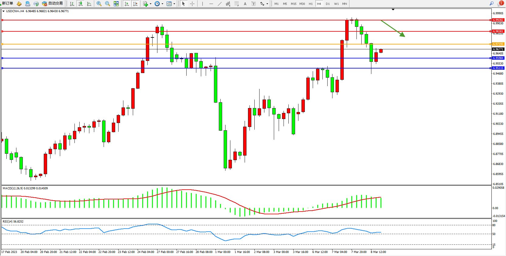 美元人民币USDCNH——4小时K线图显示: