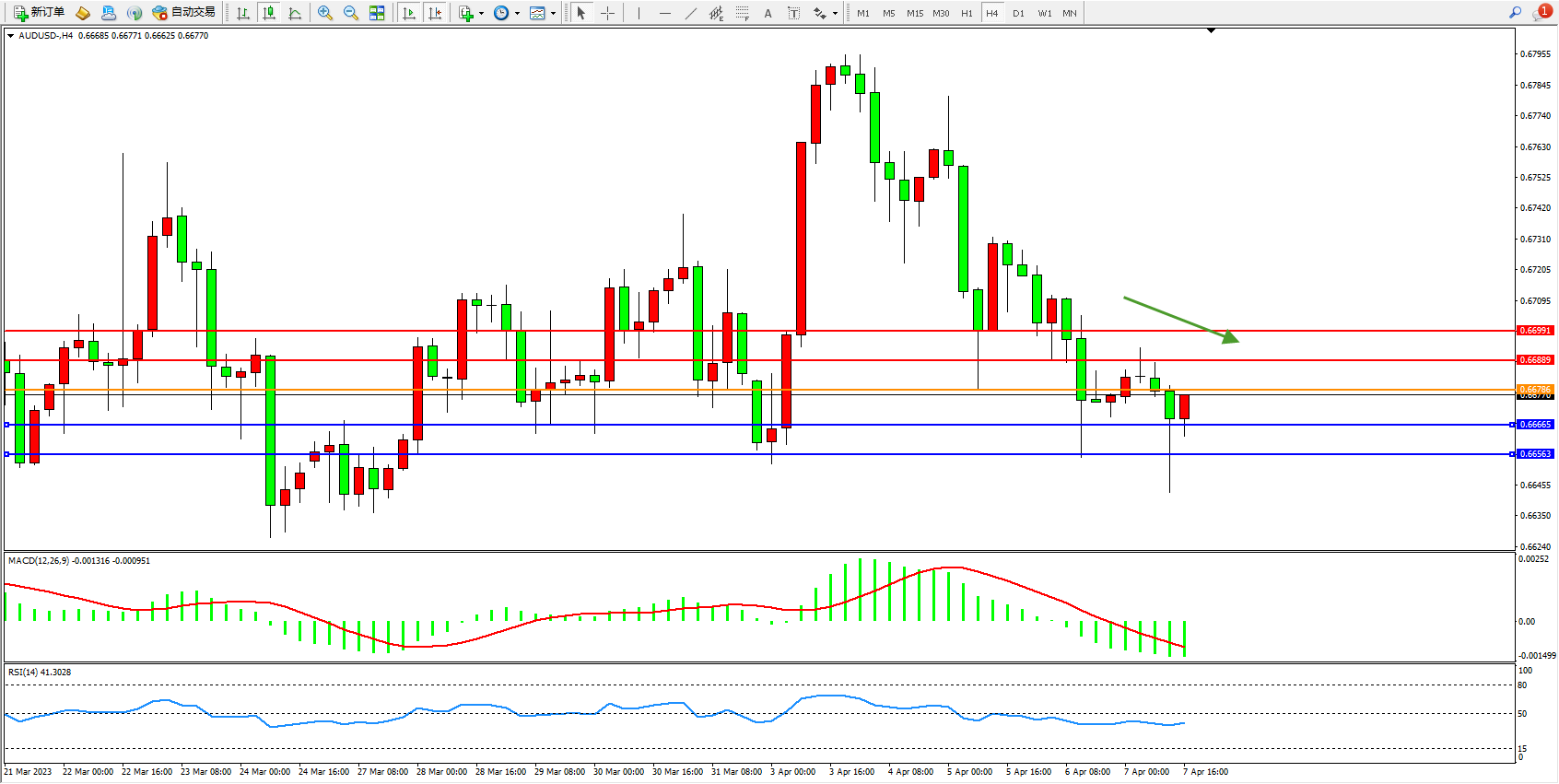 交易策略:0.66786下方看跌,目标0.66665 0.66563