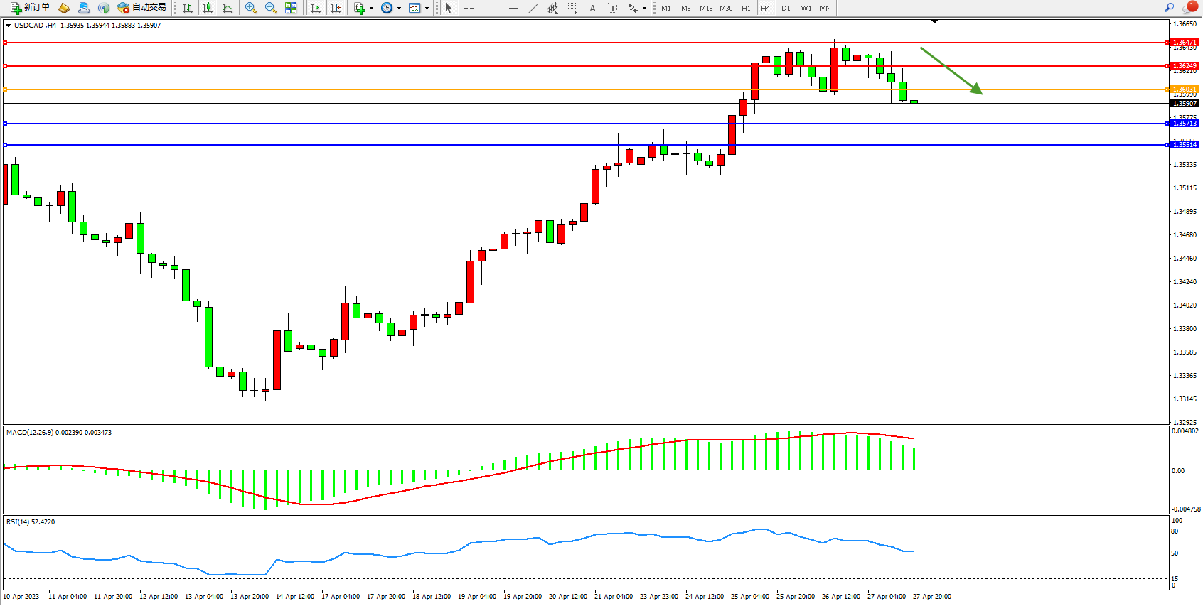 美元加元USDCAD——4小时K线图显示: