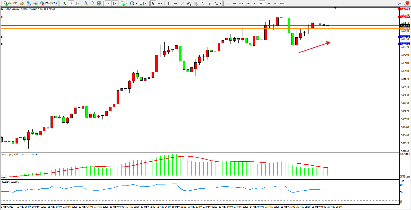 美元人民币USDCNH——4小时K线图显示: